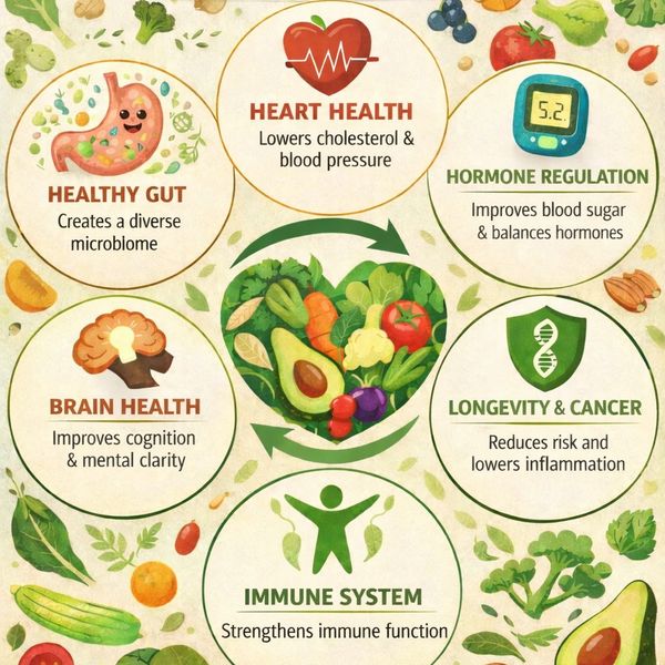 High-fiber, nutrient-dense plant foods support stable blood sugar levels and improved insulin sensitivity, which plays an important role in metabolic health and hormone balance.